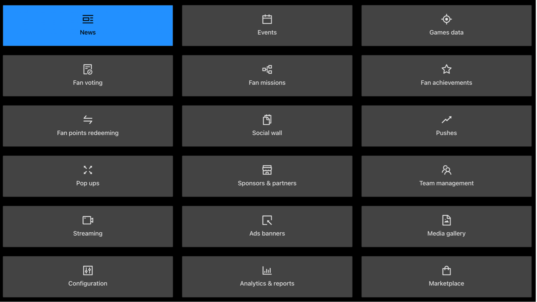 Our Content Management System is used to load and publish News, add Events and link to a 3rd party ticketing platform (or use our integrated ticketing solution), upload matches and tournaments or live feed these through an integrated solution such as Sports Radar, set up fan Voting and Polls, create Fan Missions and Achievement as well as provide fans the ability to convert their rewards into premium memberships or other benefits.